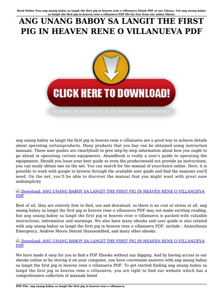 Our book servers spans in multiple countries allowing you to get the most less latency time to download any of our books like this one. Ang Unang Baboy Sa Langit The First Pig In Heaven 313 eBooks National Mid-week- 1991 Ang Sining Ng Tula at Maikling Kuwentong Pambata2001 Ed- 2001 Carancal the tiny hero-Cora Dandan 2002 Carancal can eat huge amounts of food but never seems to get full or grow taller than the span of a hand. Ang Unang Baboy Sa Langit ni Rene O.